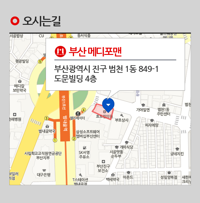 지하철 1호선 범내골역 4번출구 하차 (2호선 이용시 서면역에서 환승)