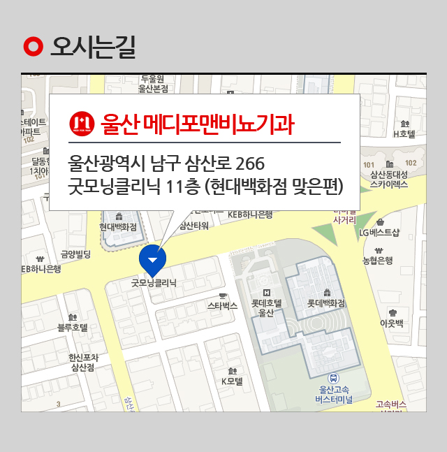 | 울산 메디포맨주차장 | 본 건물 뒷편에 있는 병원 무료 주차장 (간판이 부착된 곳에 주차하시면 됩니다) | |