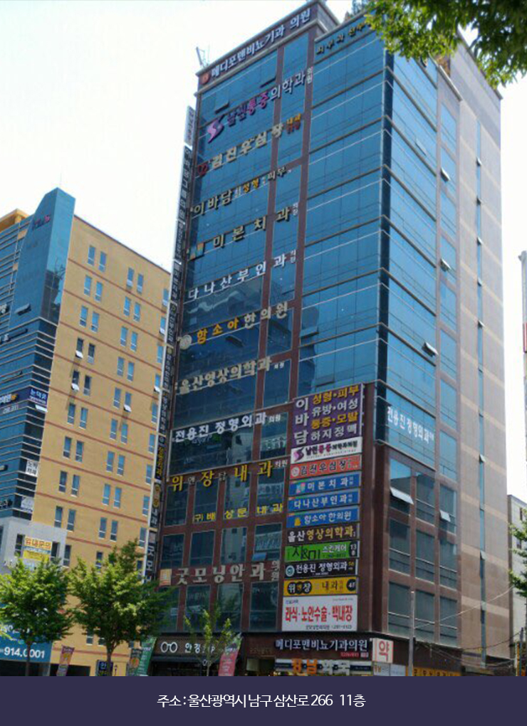 울산광역시 남구 삼산로 266 굿모닝클리닉 11층 (현대백화점 맞은편) / 대표번호 : 052 - 276 - 9111
